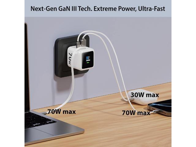 - Powerful 70W GaN 3 Charging: This wall charger utilizes advanced GaN 3 technology to deliver up to 70W of power for ultra-fast and efficient charging of laptops (Macbook,Galaxy Book4 Pro, IdeaPad, Vivobook,Chromebook, Pixelbook, XPS and more), tablets(iPad, Galaxy Tab, Pixel, Kindle Fire HD 10 and more), smartphones(iPhone 17/16/15/14/13/12/11, Galaxy S25/24/23/22/21) and more, and other electronic devices, ensuring fast and efficient power delivery.