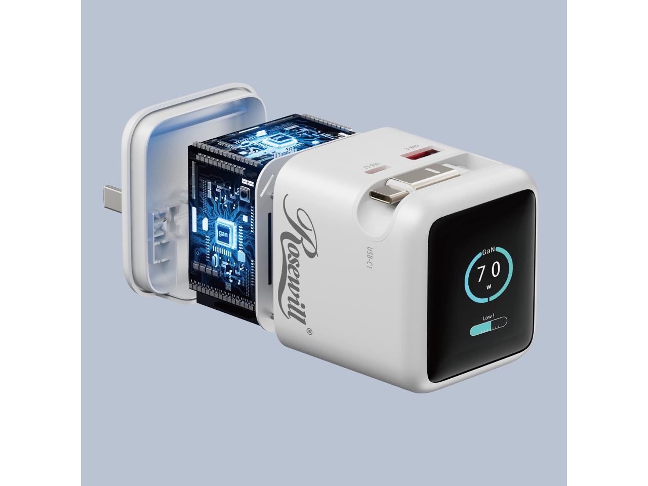 Rosewill 70W Retractable USB-C Wall Charger with Built-in Cable, 3-Port GaN 3 Fast Charging, Foldable Design & Real-Time TFT Display for MacBook, iPad, iPhone, Galaxy - White