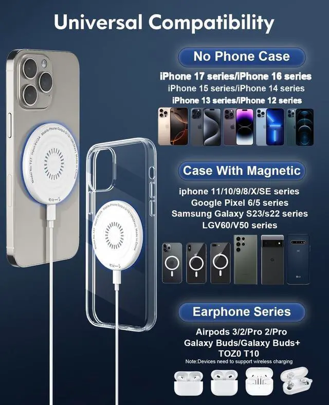 Compatible Phone Models: iPhone 17/16/15/14,17/16/15/14 Pro,17/16/15/14 Pro Max,17/16/15/14 Plus; iPhone 17 Air, iPhone 13, 13 Pro,13 Pro Max,13 Mini;iPhone 12, 12 Pro, 12 Pro Max, 12 Mini, and AirPods Pro 3 2. (models with Mag-Safe case also supports magnetic charging.)