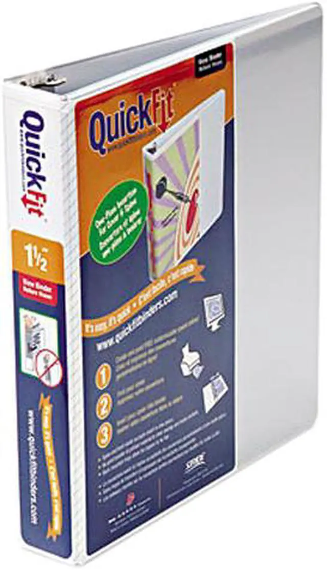Quick Fit Binder features a unique overlay design that allows a single sheet to create a one-piece custom insert that wraps around the spine to the front cover. Customize your title pages with free online templates. Overlay is made of no print-transfer vinyl. Angle-D rings hold up to 25 percent more letter-size paper than standard round rings of the same size. 1-1/2" capacity holds approximately 350 sheets. The steel rings are mounted on the back cover so pages can lie flat. Binder also offers two clear inside pockets and exposed rivets.