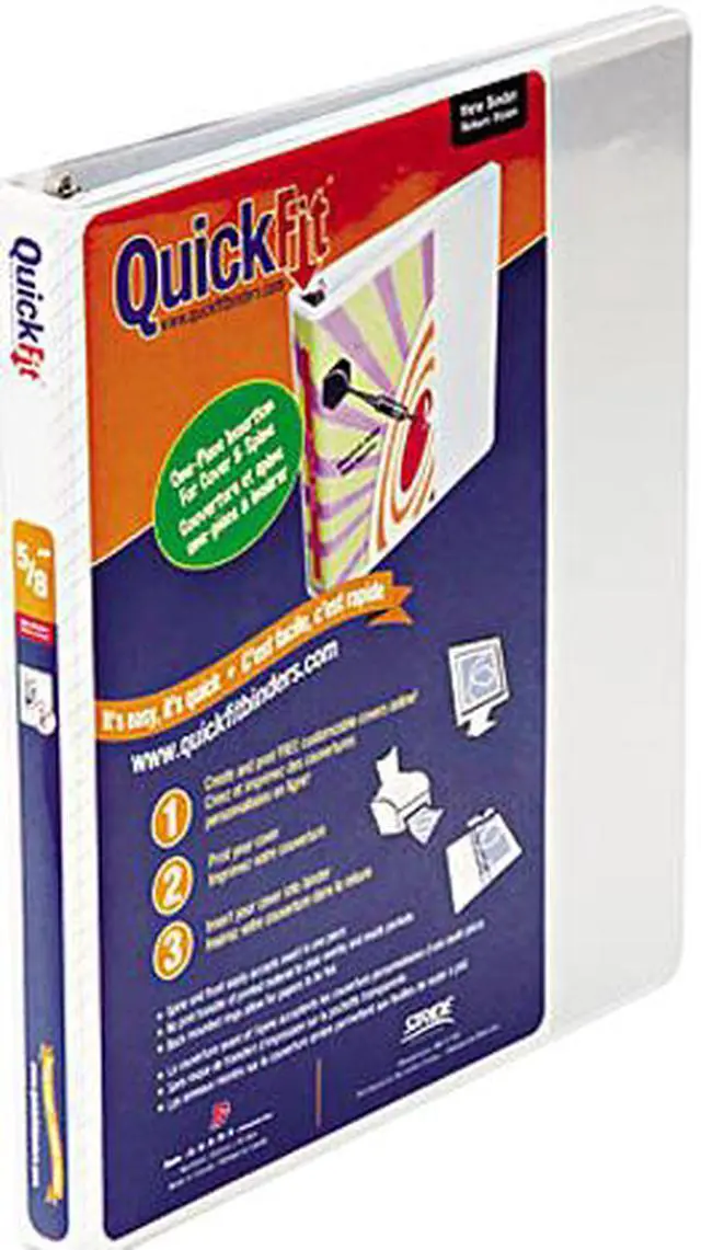 Quick Fit Binder features a unique overlay design that allows a single sheet to create a one-piece custom insert that wraps around the spine to the front cover. Customize your title pages with free online templates. Overlay is made of no print-transfer vinyl. Angle-D rings hold up to 25 percent more letter-size paper than standard round rings of the same size. 5/8" capacity holds approximately 150 sheets. The steel rings are mounted on the back cover so pages can lie flat. Binder also offers two clear inside pockets and exposed rivets.