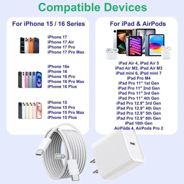 10Foot long usb c cable iphone 17/16 charger cord allows to charge anywhere, extra long design can charge while lying on sofa,bed or living room