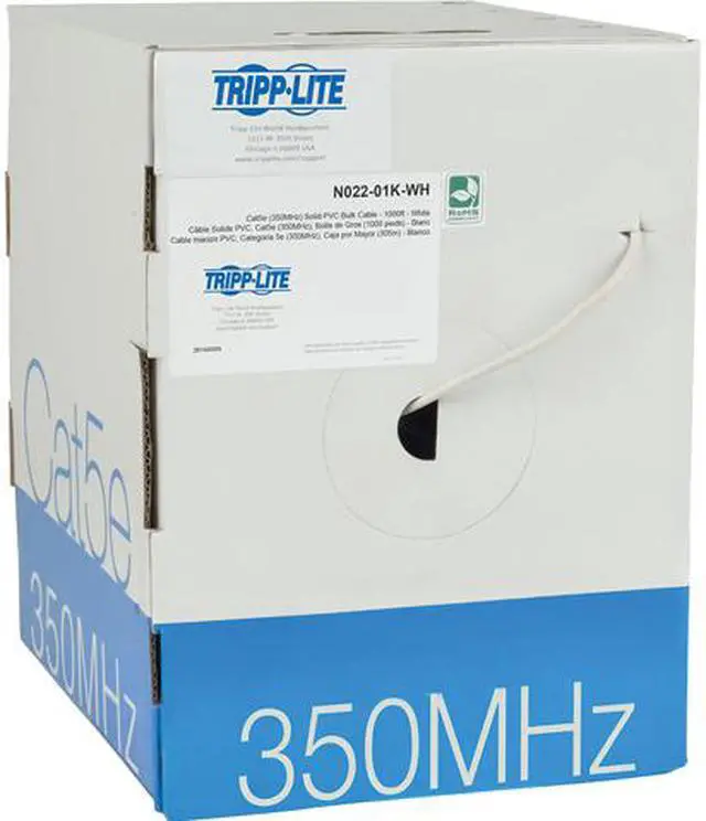 The N022-01K-WH Cat5e 350 MHz Bulk Solid-Core PVC Cable is premium cabling designed for Cat5/5e premise applications, such as connecting an Ethernet wall jack to a router, patch panel or switch. Designed for fast transmission and excellent signal quality, this white cable ensures peak performance through your LAN (local area network).