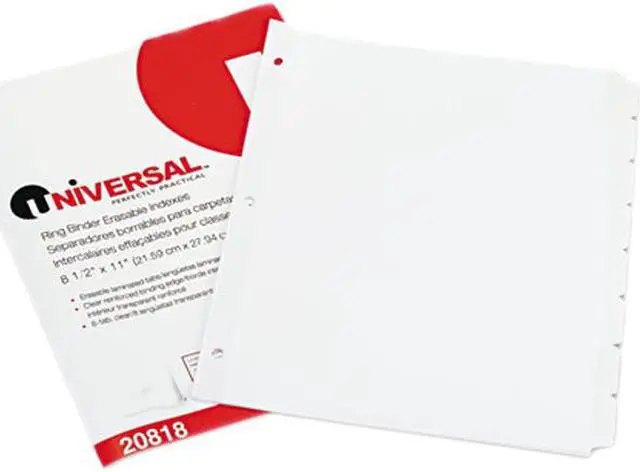 Organize reference, presentation, project or storage binders with these white tab indexes. The prepunched holes for three-ring binders are reinforced with clear plastic to resist tearing, and eight side tabs are clearly visible to quickly read labels and locate information. These Universal tab indexes let you write directly on coated tabs with nonpermanent ink and erase labels to reuse indexes as needed.