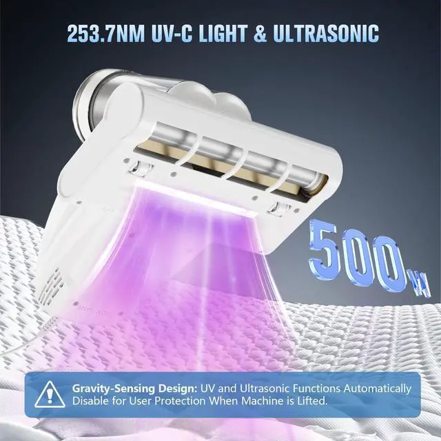 POWERFUL MATTRESS VACUUM: Our mattress vacuum cleaner features a 500W motor delivering 16kPa suction and high-frequency beat action. Deeply penetrates mattresses and fabric layers to effectively remove fine dust and dander. Enjoy fresher mattresses, beds, and sofas for a healthier sleep environment and home life. ADVANCED UV-C TECHNOLOGY: Our bed vacuum cleaner features a 253.7nm UV-C light and 40,000Hz ultrasonic waves to penetrate deep into mattress layers, eliminating 99.9% of invisible substances. Equipped with gravity-sensing rollers, the UV-C light automatically activates upon surface contact and deactivates when lifted/tiltedpreventing leakage and ensuring safety. DUAL DUST CUP SYSTEM: The handheld vacuum cleaner features a multi-layer filtration + dual-chamber design (500ml total capacity). Isolates debris/dander from dust to prevent HEPA clogging extending filter lifespan and maintaining peak suction power. (Includes 2 HEPA filters) 140°F HIGH TEMPERATURE AIR HEATING: Our bed vacuum cleaner only takes 5 seconds of fast heating time, and the temperature can reach 140°F, efficiently destroying and eliminating up to 99.9% of dirts. It is very suitable for families with pets.Built with quadruple protection (over-voltage,current, overheating, short-circuit). Note: Continuous extended use may trigger thermal safety shut-off; simply allow to cool before resuming. ANTI-ENTANGLEMENT DESIGN: The metal strip roller brush design of our mattress vacuum cleaner is not easy to scratch sheets and other fabrics and can prevent hair entanglement, providing you with a healthier and more comfortable home. EXTRA-LONG POWER CORD: Equipped with a 5-meter (16.4 ft) power cord, this vacuum cleaner allows you to clean larger areas and can run continuously for hours to meet your daily cleaning needs.This thoughtful gift is perfect for friends, family, partners, and parents especially households with babies seeking cleaner sleeping surfaces.