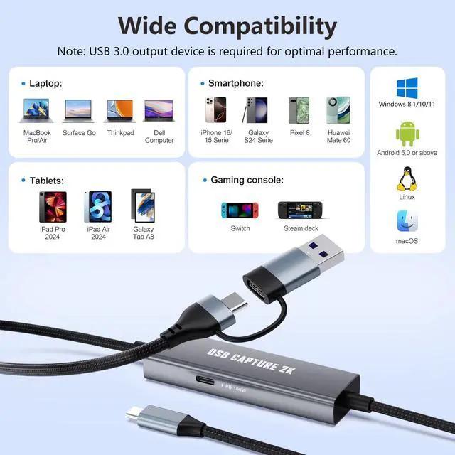 Type-C to USB-A/C Universal Compatibility Specially designed for Switch, Steam Deck, iPad, and USB-C phones, this 2-in-1 capture card connects seamlessly to both USB-A and USB-C hosts (PCs, laptops, tablets). *Note: HDMI devices like PS5/Xbox are not supported.