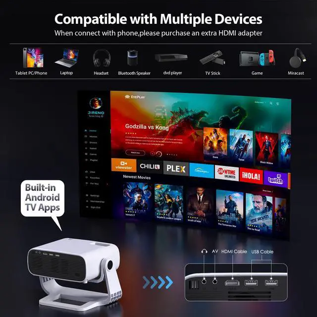 Projector With Wifi and Bluetooth: In 2026, we not only added smart functions to the old version, allowing users to watch videos with only a projector, but also improved the original same-screen transmission function. 5G/2.4G Dual-Band WiFi and Two-way Bluetooth 5.1 make transmission more convenient, stable, and fast. It can be perfectly connected with TV Stick, iphone, android phone, Tablet, Laptop, audio, PC, USB Flash Disk, PS4, Gaming Consoles, etc. Bluetooth can connect your multimedia device and projector, so that the projector can be used as a speaker. If you want a more professional sound effect, you can also connect the projector to speaker or headphone