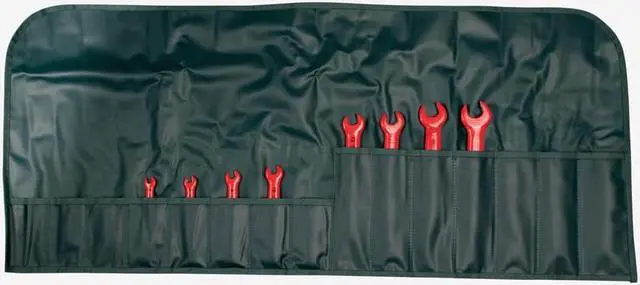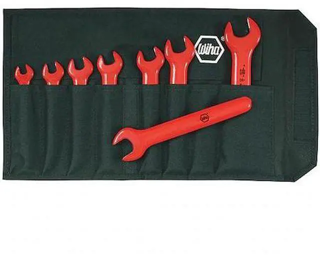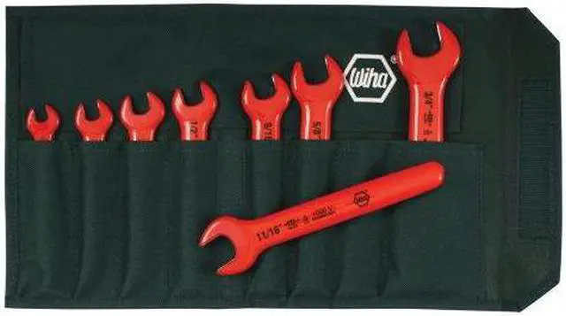 Open End Wrench Set, Alloy Steel, Natural, Number of Tools 8, Range of Head Sizes 5/16 in to 3/4 in, 10 Degrees, Insulated Yes, Clamshell, SAE, Single End, Rounded, Cushion Grip, 3 29/32 in to 7 in, Head Thickness 9/32 in, 5/16 in, 11/32 in, 13/32 in, 29/64 in, 15/32 in, 1/2 in, 27/32 in. This item has been restricted from sale in the following state (s): []