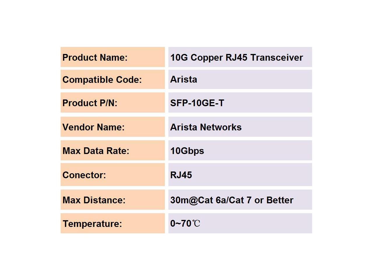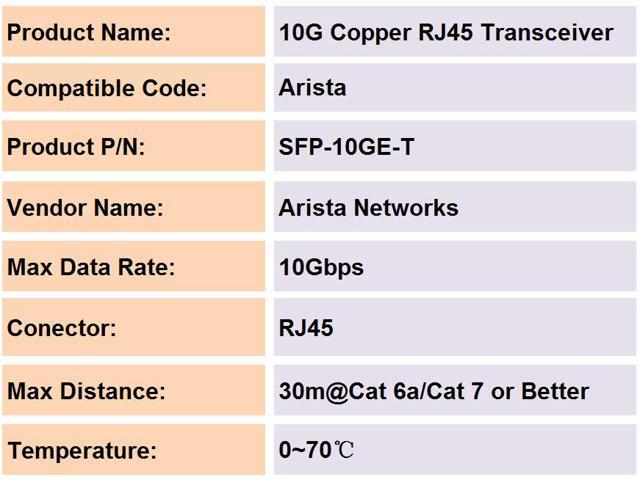 - * COMPATIBILITY:This 10G Copper SFP+ Transceiver is 100% compatible for Arista SFP-10GE-T, connecting 10g ethernet Switch, Edge Router, servers, network interface card (NICs) , media converter etc;