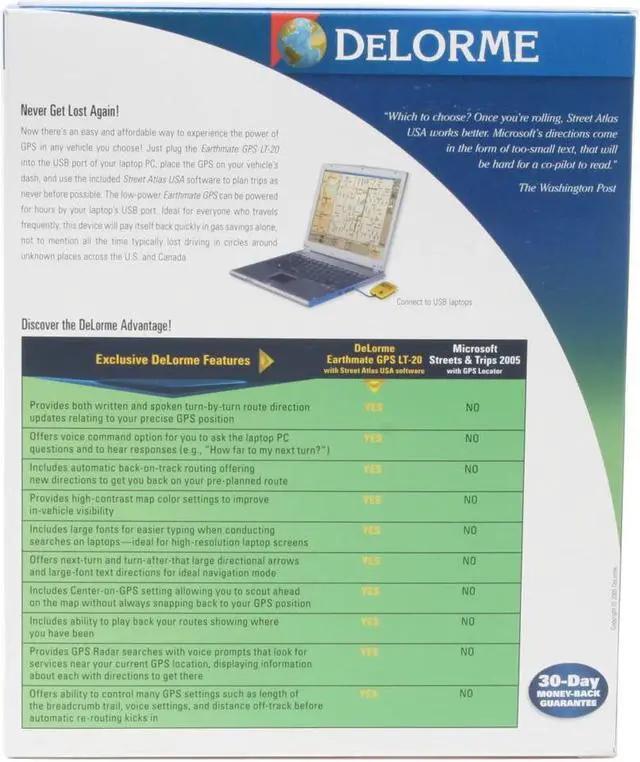 | Feature | Never Get Lost Again! Plug the Earthmate GPS LT-20 into the USB port of your laptop PC(No GPS batteries are needed). Install the Street Atlas USA 2006 software, choosing to load the entire second data disc onto your hard drive if you want. The software also includes over 4 million places of interest. Place the GPS as close to your front windshield as possible, ideally using the enclosed suction cup on the attached cable to hold the GPS against the glass. Click on the software GPS tab and you'll see your position updated in real time on the maps as you drive. There are many custom GPS options included within the GPS tab. Earthmate GPS includes a built-in LED that transitions through the various satellite acquisition modes: red for searching, yellow for two satellites in view, and green for at least three satellites in view. Earthmate GPS is a 12-channel NMEA-compliant receiver. |