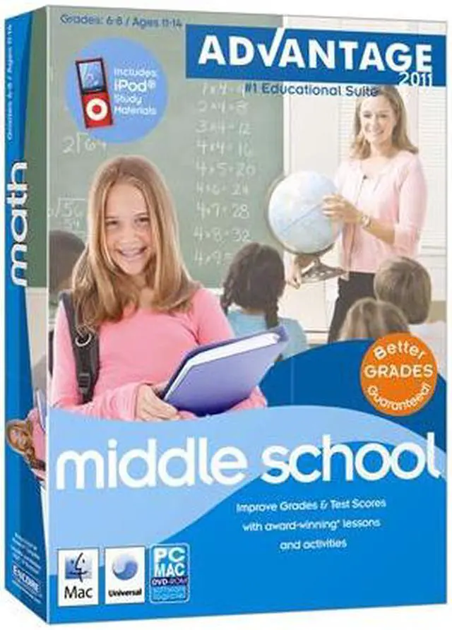 | Feature | Advantage provides an interactive learning experience and the tools students need to gain learning confidence and improve their grades. Middle School Advantage is a complete student resource center that combines lessons, exercises and quizzes with additional learning resources to support and motivate your child in reaching his full academic potential. With Middle School Advantage, your child will develop and test his knowledge in Math, English, Social Studies, Science and Foreign Language. Additional study aids such as iPod study materials and Encyclopedia Britannica Ready Reference support the learning process and brain-building games make studying fun. The ADVANTAGE Approach to Effective Learning: ENGAGE: Interactive learning experience engages the student. REINFORCE: Standards-driven lesson plan reinforces classroom learning. SUPPORT: Study aids & reference tools support the learning experience. MOTIVATE: Brain-building games add fun to studying. A COMPLETE STUDENT RESOURCE CENTER Subject Areas: Math. Science. English. Foreign Language. Student Resources: Encyclopaedia Britannica Ready Reference. iPod study materials. Math: Pre-Algebra Algebra Algebra II Graphing Science: Living Organisms The Human Body Cell Biology Genetics U.S. History Early Civilizations Colonization & New Settlement Revolution & The New Nation The Civil War & Reconstruction The Great Depression & WWII The Contemporary United States Foreign Language Spanish French German Italian Download iPod study materials and study on the go! * The Advantage Money Back Guarantee |