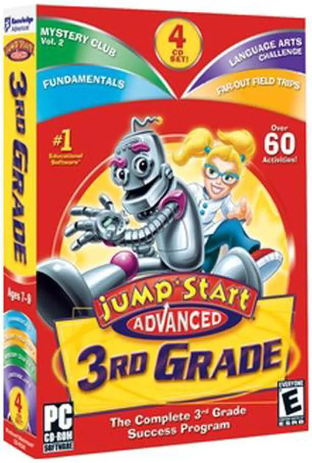 The Complete 3rd Grade Success Program, the JumpStart Advanced 3rd Grade 4-CD set challenges kids with time-traveling puzzles and wild adventures as it develops their skills in math, history, science, art and critical thinking. Disc One, Fundamentals, Travel back in time and build math, history and science skills as you solve puzzles. Disc Two, Far-Out Field Trips, Use history, science, and art skills to earn points in this action-packed adventure game. Disc Three, Mystery Club Vol. 2, Use gadgets to investigate crime scenes, unravel mysteries and crack cases. Disc Four, Language Arts Challenge, test your knowledge of history and language arts in this mind-bending quiz game. Over 50 Skills Taught! Math, Addition & Subtraction, Multiplication & Division, Measurement, Fractions, Social Studies, History, Geography, Language Arts, Spelling, Grammar, Vocabulary, Synonyms & Antonyms, Parts of Speech, Art & Music, Art Styles & History, Music Appreciation, Science, Life & Earth Sciences, Astronomy.