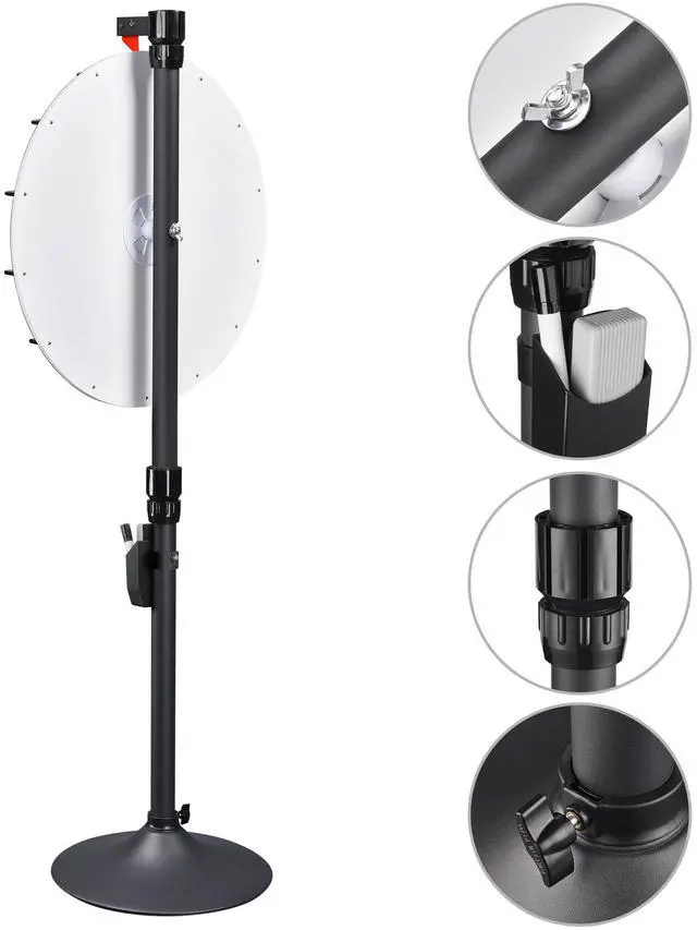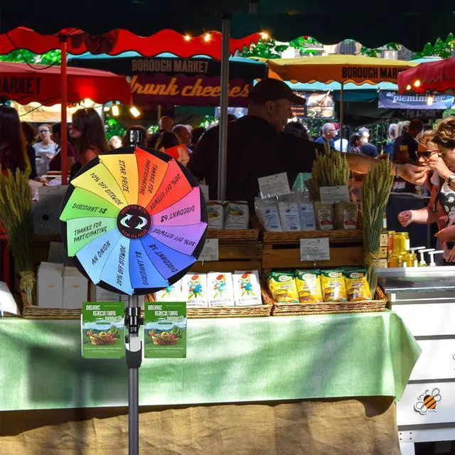 WinSpin Prize Wheel & Prize Drop Kit includes 1pc 24" color prize wheel with 12 slots for writing logos or text and 1pc 41" x 25" prize drop game board with 12 playing pucks. It is designed to customize prizes or create different winning rules according to play ways of different activities such as trade shows, carnivals and parties.