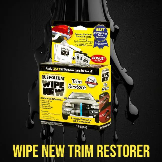 Wipe New Trim Restore The Wipe New Trim Restoration Kit returns weatherfaded or grayedout trim to showroomlike condition while giving it an extra layer of protection. The DIY kit includes everything needed to treat the total interior or exterior of one midsized sedan and is ideal for use on cars trucks vans motorcycles and more. Just one application renews vehicles' plastic vinyl and rubber for upwards of two years. ustOleum Wipe New Trim Restore is designed to renew restore and protect worn automotive trim and plastic for years. Great for door panels trim side mirrors bumpers dashboards leather and vinyl seats and more.