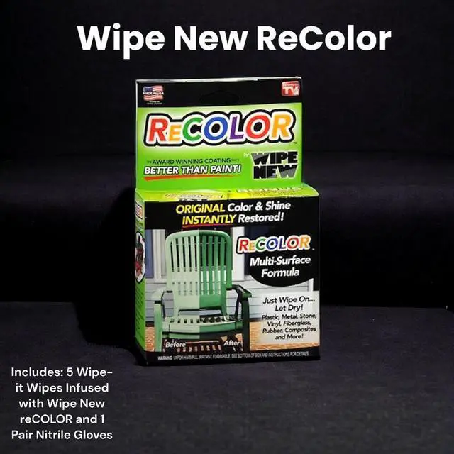 ReColor by Wipe New offers a wipe-on clear coat that saves both time and money compared to traditional paint. It restores surfaces to their original color with a perfect match every time while the easy wipe-on application eliminates messy paint drips brush marks and overspray. Achieve a flawless factory finish on any surface in just minutes at a lower cost per square foot than paint. ReColor's performance is backed by an award-winning brand known for its innovative long-lasting products. The kit includes 5 Wipe-it Wipes infused with ReColor and 1 pair of nitrile gloves.