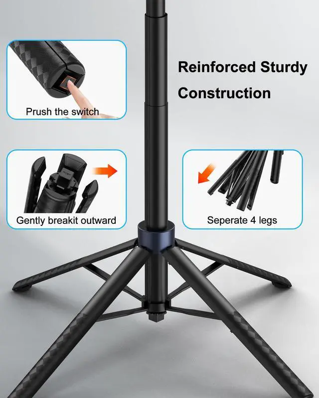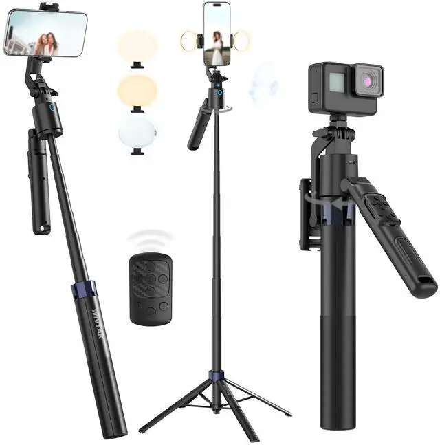 Say Goodbye to Shaky Footage: The selfie stick tripod with remote is made of high-quality aluminum alloy, anti-slip rubber pads, and quad tripod provide excellent stability, effectively reducing shake and delivering smooth video and photos. It also features two detachable LED fill lights, ensuring clear and bright images even in low-light conditions.