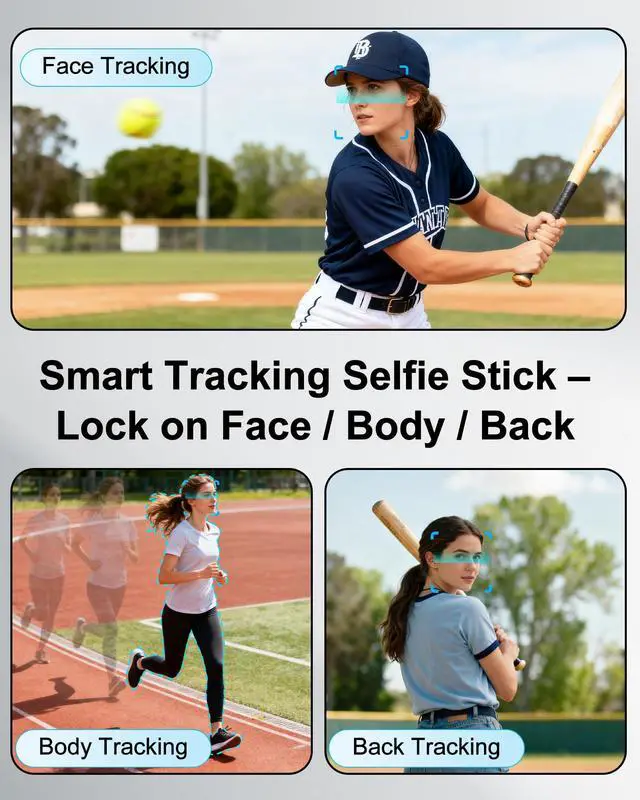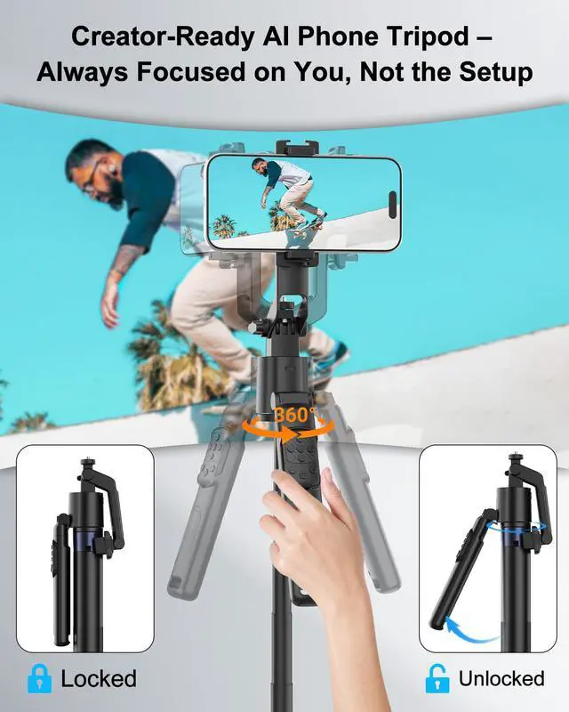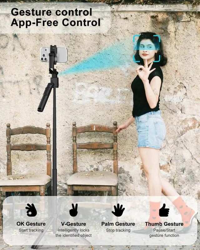 Smart AI Tracking: This auto face tracking tripod features real-time AI that auto-locks on faces/bodies, following you 360° with no dead angles. Control it hands-free: show an "OK" gesture to start recording, a palm to pause, or a "V" to lock on subjects. Perfect for solo creators, it tracks up to 5m, making it the ideal vlogging kit for indoor live streams and outdoor adventures.
