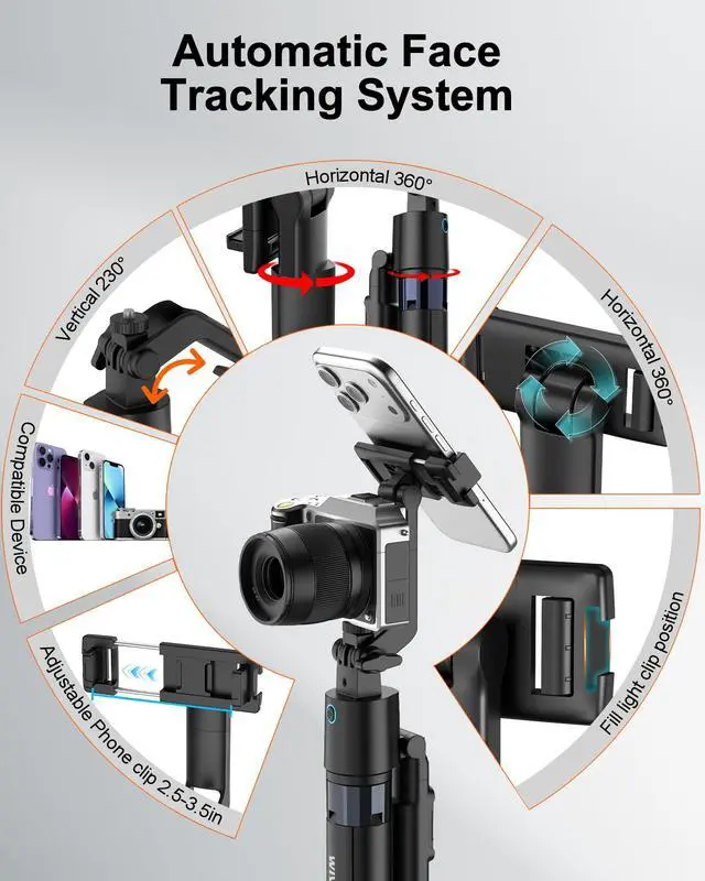 70" Auto Face Tracking Selfie Stick Tripod for iPhone/Android/Mini Camera, 360° Rotation Phone Tracking Tripod with Remote, 2Pcs Fill Lights, Phone Stand for Vlog Live Stream Video Recording