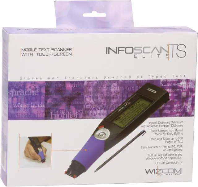 Carry a dictionary with you wherever you go, the Wizcom Infoscan TS Elite is a handheld pen scanner that has the American Heritage English Dictionary included. Text to speech technology lets you hear exactly how a word should be pronounced. A 5 line touch screen shows what you have scanned and makes it easy to choose words for definition or pronunciation help.
