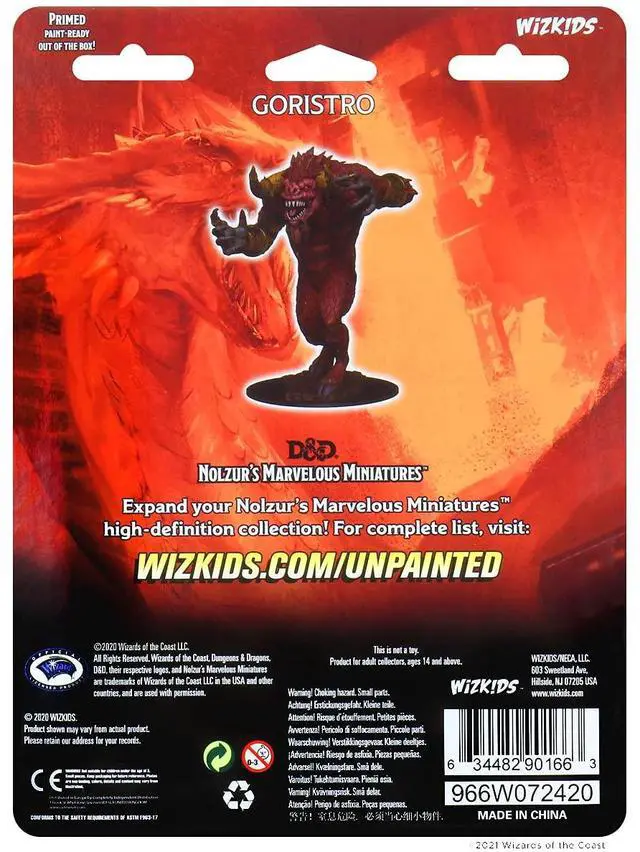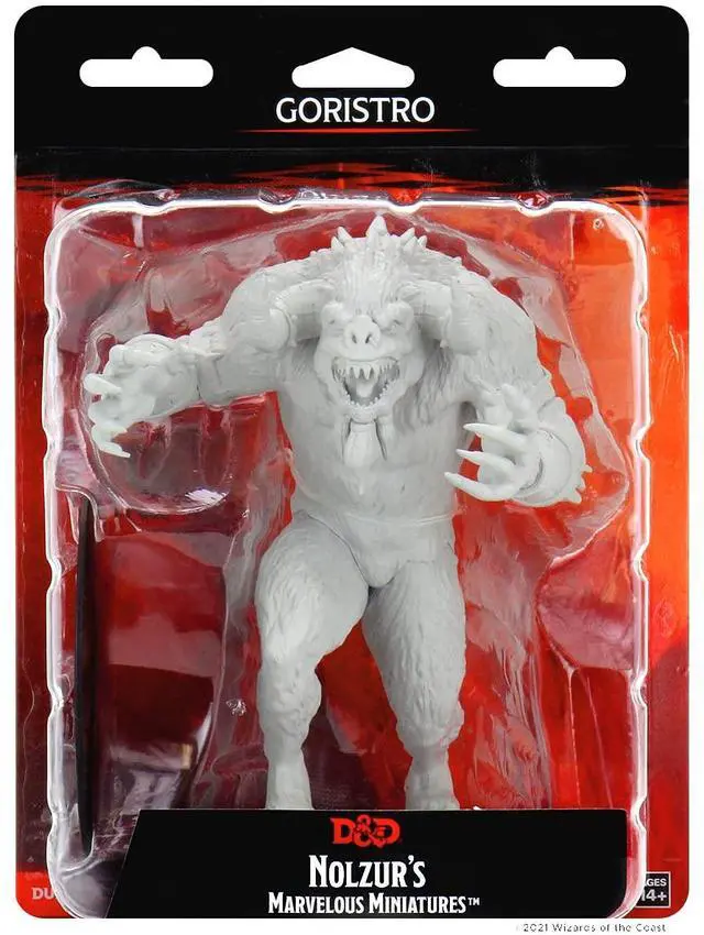 Dungeons & Dragons Nolzur?s Marvelous Miniatures come with highly-detailed figures, primed and ready to paint out of the box. These fantastic miniatures include deep cuts for easier painting. The packaging displays these miniatures in a clear and visible format, so customers know exactly what they are getting. This is a 1-count monster pack featuring the Goristro.