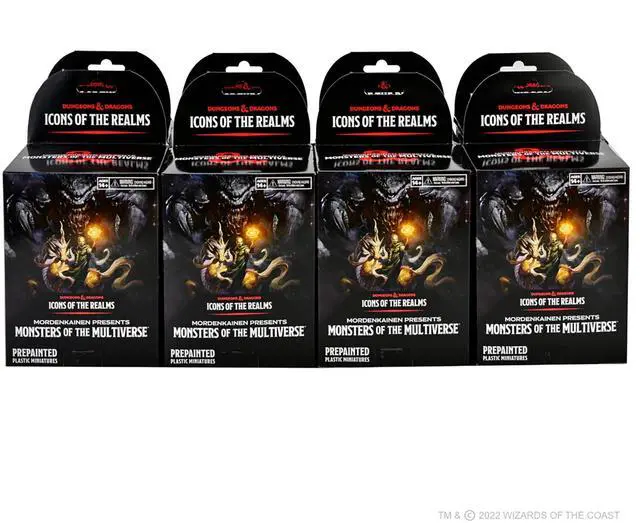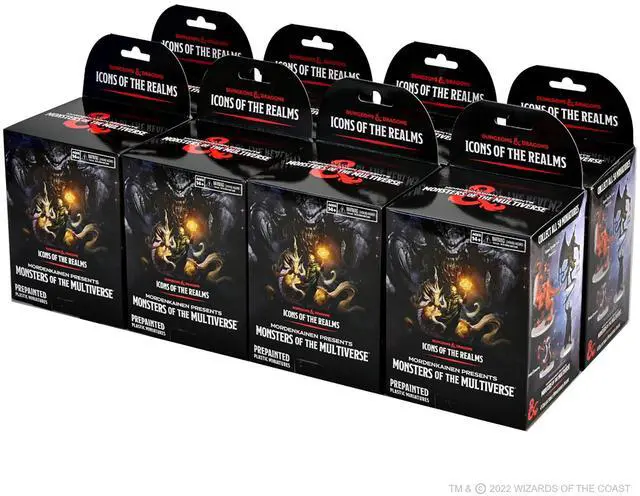 Dungeons And Dragons Icons of the Realms Miniatures: Mordenkainen Presents Monsters of the Multiverse Brick (8 Pack). The 23rd set in our Icons of the Realms line of pre-painted Dungeons & Dragons miniatures. Hailing from every corner of the multiverse, these creatures represent some of the most benevolent and malevolent forces that D&D heroes might face. Mordenkainen has faced many of these monsters and peoples on numerous wondrous adventures. Now it?s time for you to venture forth and face these creatures yourself! This Icons of the Realms fantasy miniature release comes with 8 Boosters (4 Miniatures in Each) for a total of 32 Miniautres. Boosters each contain four figures total: 1 Huge or Large figure and 3 Medium or Small figures.
