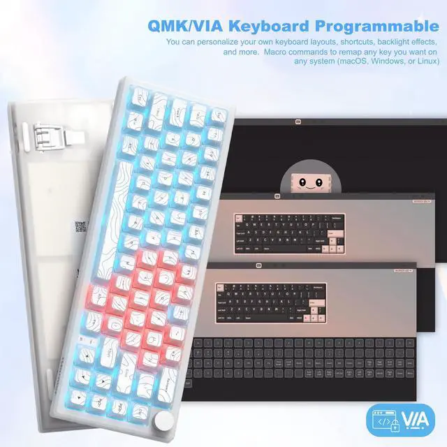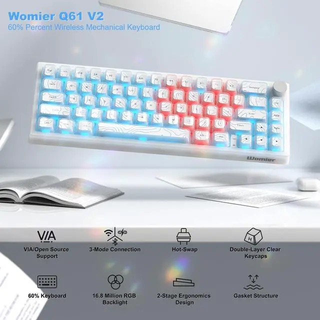 Merchant VideoWOMIER Q61 V2 mechanical keyboard series. The topographic keyboard with a double-layer design achieves the ultimate beauty of RGB lighting effects. The keyboard is dreamy in a bright environment and dazzling in a dark one