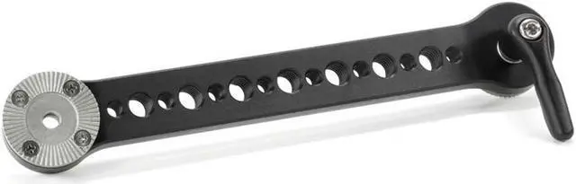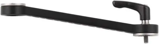 Rosette extension arm with ARRI style rosettes on each end. For use with Crossbar, Bolt on Rosette (ARRI), Rosette Handle, and other ARRI compatible rosette equipment. M6 adjustable thumbscrew. Extends hand grip 6.6 inches (168mm) and jogs out 1.6 inches (42mm).