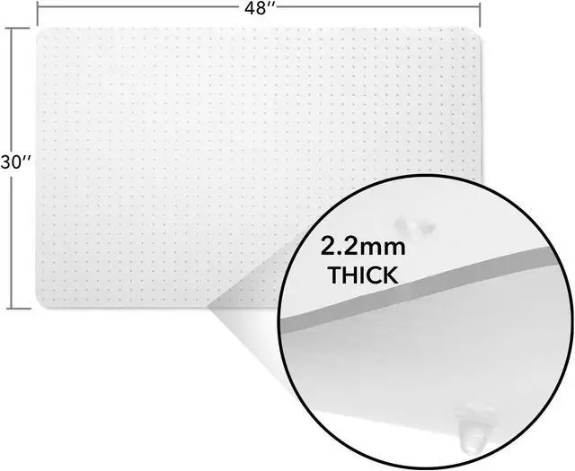 The 2.2 -millimeter thickness is specifically designed for low profile carpets that are 1/4" deep or less and creates a safe rolling environment while protecting your carpet. The vinyl construction withstands daily use, while the clear material lets your carpet show through. This mat features a studded underside to safely grip your carpet without piercing your carpets backing. The textured surface allows your chair to slide effortlessly across the mat without slipping while the beveled edge builds a smooth transition from mat to carpet to help prevent tripping hazards or stubbed toes.