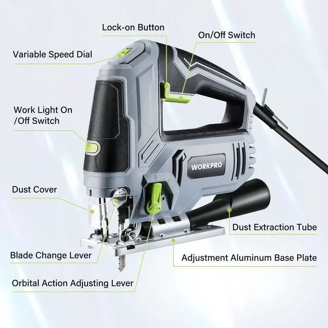 | Included Components | 1 × jigsaw, 6 × Replaceable T-shank blades(1 for metal, 6 for wood), 1 x Scale Ruler, 1 x dust exhaust pipe, 1 x user manual, and 1 x Allen wrench. |