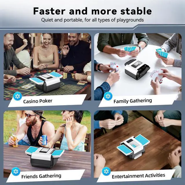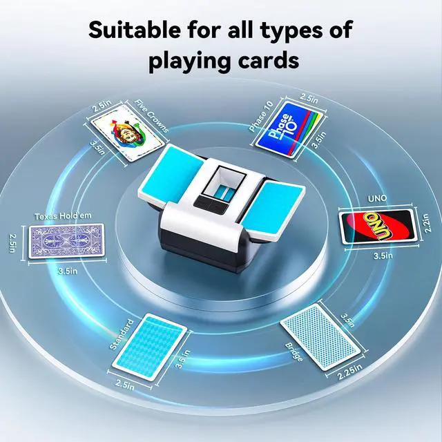 Product Description Bring the casino experience home with the 2-in-1 Automatic Card Shuffler & Dealing Machine. Designed for both fun and fairness, it combines automatic shuffling and precise card dealing in one powerful device. Supporting up to 12 players, its perfect for poker nights, blackjack tables, UNO parties, or large family gatherings. The included 4 wireless remote controls let players deal cards at the push of a button, with the ability to customize card quantity, player numbers, dealing direction, and distance to fit any game. Unlike noisy machines, this dealer features a low-noise motor, ensuring smooth, quiet operation. With a built-in rechargeable battery, it eliminates the need for disposable batteries, making it eco-friendly, economical, and convenient. Compact yet advanced, this card shuffler & dealer is the ultimate accessory for card enthusiasts, casinos, and party hosts alike. Makes an impressive gift for card players, families, and poker lovers who value fairness, fun, and technology in every game.