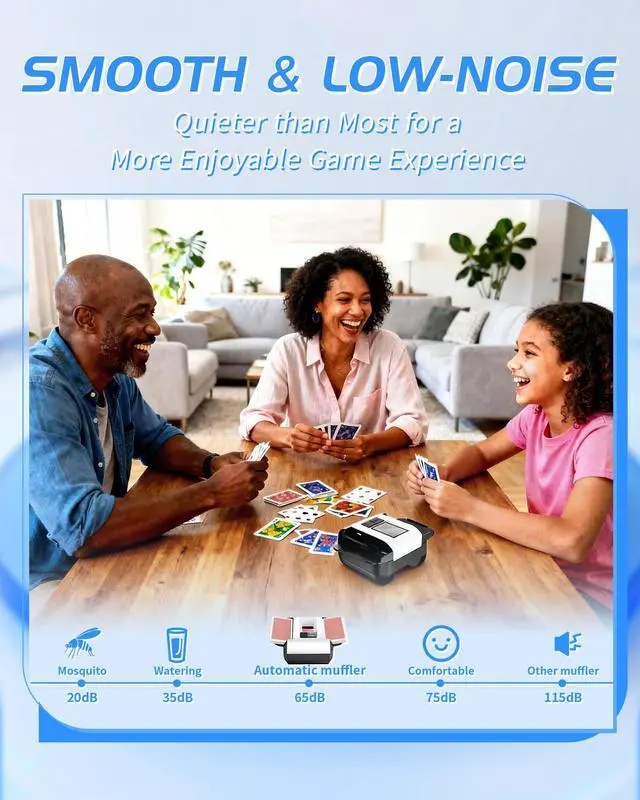 Quiet & Focused GameplayEngineered with a low-noise motor, our shuffler operates quietly without disrupting your game's concentration or atmosphere. Enjoy immersive and social gameplay, free from the constant whirring of older, noisy models.