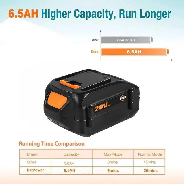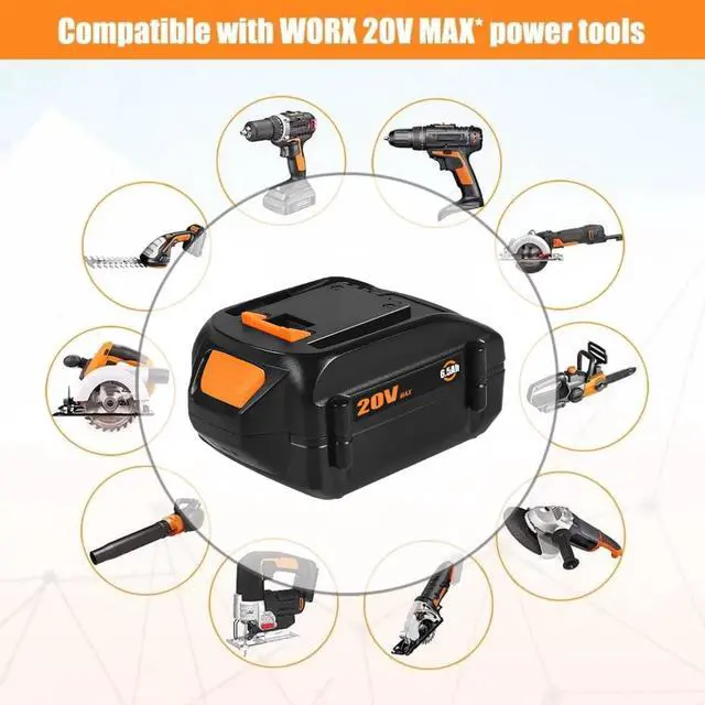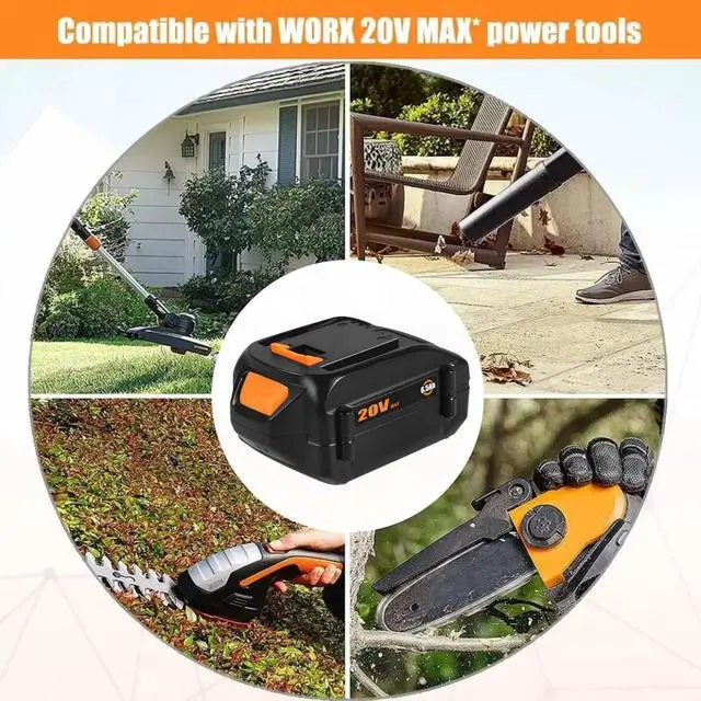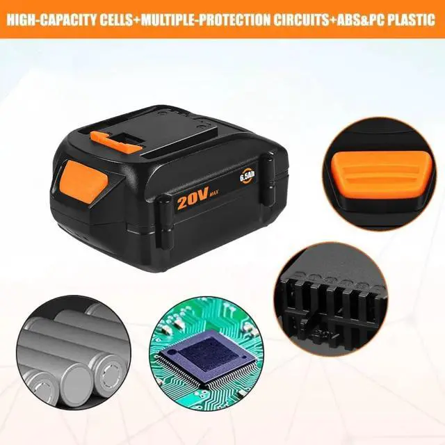 Upgrade your cordless tool experience with this high-performance 20V lithium-ion battery. Featuring an upgraded 6.5Ah capacity, this battery delivers extended run time, reducing downtime and increasing productivity for your landscaping, drilling, cutting, and other DIY or professional tasks. It is engineered to be a direct replacement and is fully compatible with a wide range of 20V power tools, including models like WG630, WG322, WG543, and WG163.