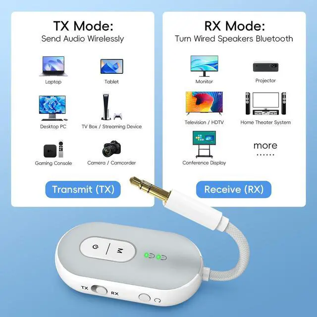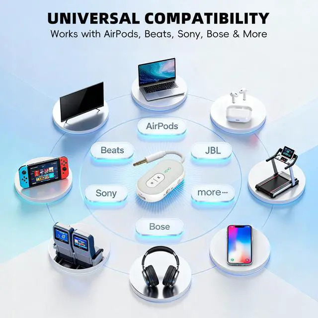 2-in-1 Bluetooth Transmitter & Receiver This versatile bluetooth transmitter and receiver lets you stream wireless audio from TVs, airplanes, gym equipment, or gaming consoles to any Bluetooth headphones, or play music from your smartphone/tablet through non-Bluetooth speakers. An essential travel and airplane gadget for on-the-go entertainment.