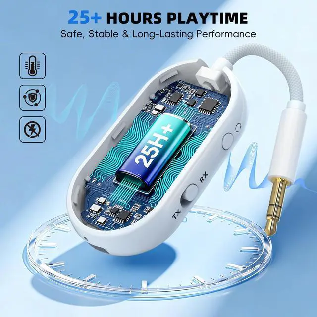 Bluetooth 5.3 Wireless Audio Transmitter & Receiver, 3.5mm AUX Adapter, Supports 2 AirPods or Headphones, 25+ Hr Battery Life, Airplane Bluetooth Adapter for Travel, Flight, TV, Car & Gym