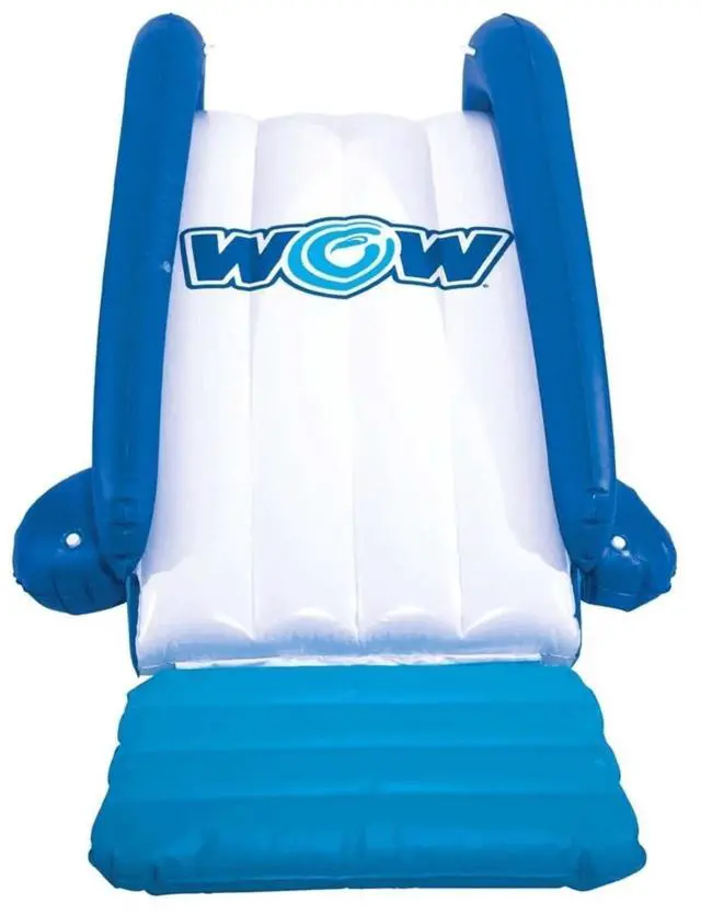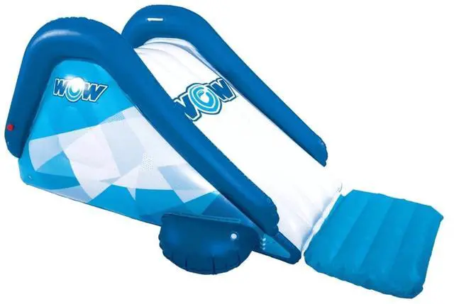 Time to dive in! The WOW Watersports Cascade Pool Slide inflatable slide adds a whole new level of fun to your pool. Connect the built-in sprinkler to your garden hose to create a slippery, fast sliding surface. And the bumper at the bottom makes sure no one has too rough of a landing.