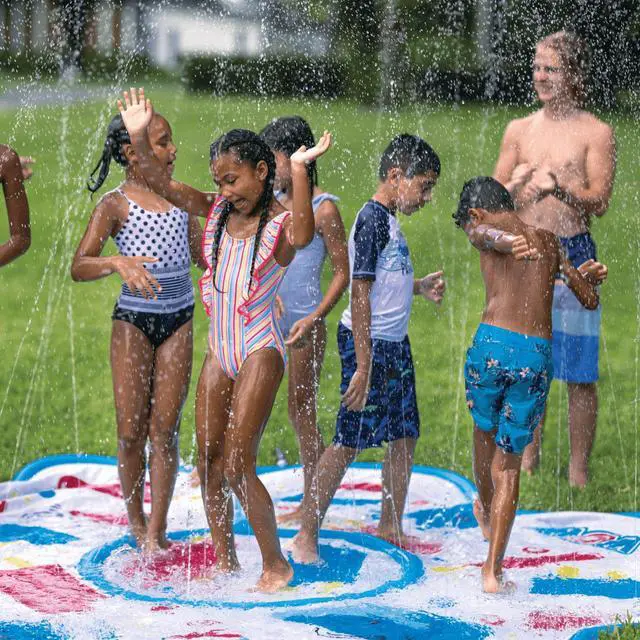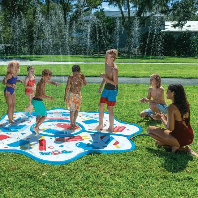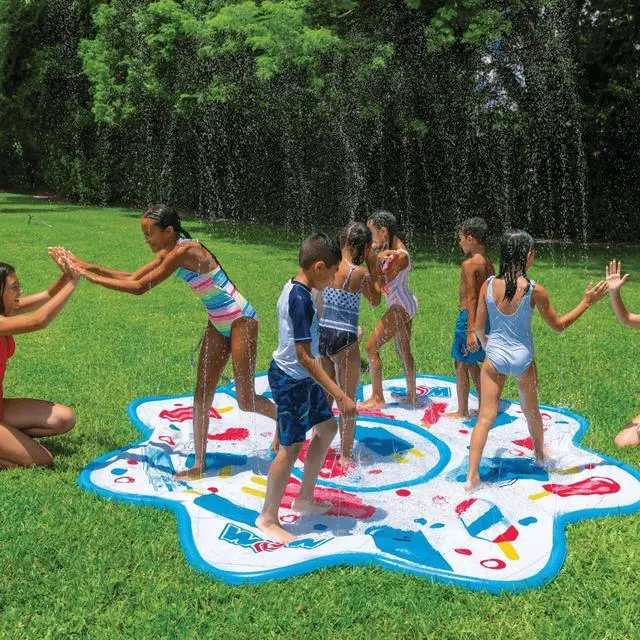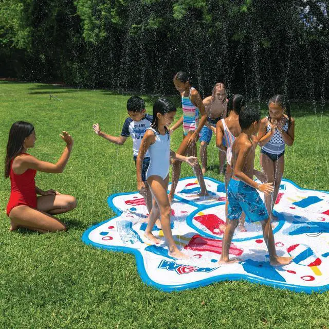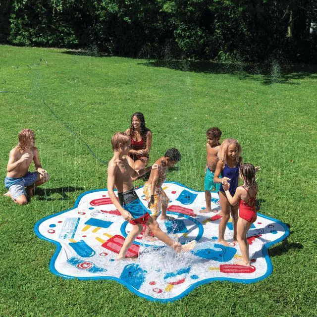 Popsicle Spray Pad: a water pad, and sprinkler in one! This giant, 10-foot water toy makes it easy to cool off while having fun. The inflatable rim keeps water pooled in the base for extra splashing action. Popsicle Spray Pad also connects to a standard garden hose that sprays water every which way. The popsicle design adds a fun summer flair, and there's truly no end to the fun with this amazing backyard sprinkler experience.