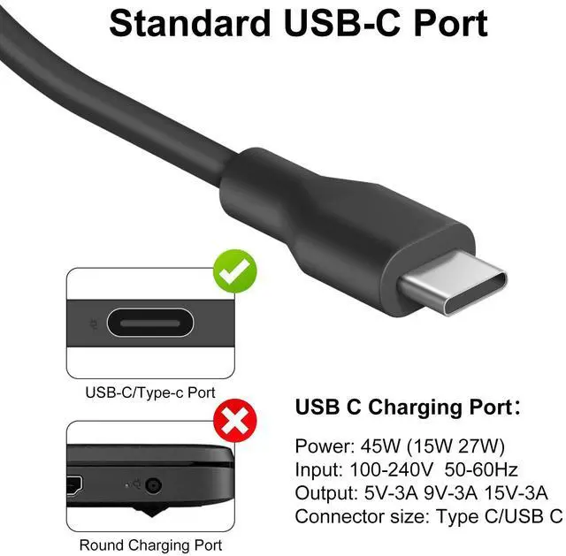 45W USB C charger compatible with HP laptop We offer a fast and efficient charging solution, compatible with all HP laptops equipped with USB C charging ports, providing reliable power wherever you go. Product Details: Input: AC 100-240V 50-60Hz Output: 5V-3A 9V-3A 15V-3A Power: 45W (15W 27W) Connector size: Type C/USB C The charger comes with the US 3 Prong POWER CABLE Purchase Assurance: We provide 24/7 online customer service support, along with a 30-day no-reason return policy and 1-year quality guarantee, allowing you to purchase and use with confidence.