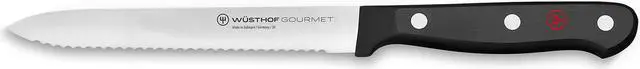 The Wusthof Gourmet 5 Inch Serrated Utility Knife creates perfect tomato slices every time. The razor sharp serrated edge cuts effortlessly through squashes, tomatoes, melons, and more. Wusthof Gourmet knives are stamped from one piece of specially formulated steel. Painstakingly manufactured, these knives are pure fun to work with and will turn even the preparation of a simply dish into a culinary pleasure. Made in Solingen, Germany.
