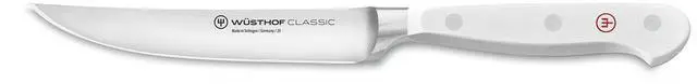 The Wusthof Classic White 5 Inch Steak Knife cuts all types of meat without tearing the fibers, thanks to the extra sharp straight edge blade. Wusthof Classic knives are forged from a single piece of high carbon no-stain steel, a specially alloyed steel. Painstakingly manufactured, these knives are pure fun to work with and will turn even the preparation of a simple dish into a culinary pleasure. Made in Solingen, Germany.