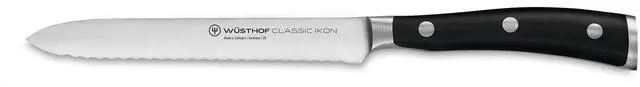 The Wusthof Classic Ikon 5 Inch Serrated Utility Knife is a versatile knife to have on hand. You can easily slice a tomato, some cucumbers or peppers, or a small loaf of bread. Wusthof Classic Ikon knives are precision forged from a single piece of chromium-molybdenum-vanadium steel. Painstakingly manufactured, these knives are pure fun to work with and will turn even the preparation of a simple dish into a culinary pleasure. Made in Solingen, Germany.