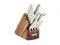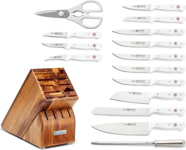 Ideal for a beginner or advanced cook, the Wusthof Gourmet 16 piece knife block set features fifteen essential kitchen knives and accessories to prepare any type of dish, nestled inside a streamlined, acacia wood storage block. The set features distinct white handled blades with the traditional Wusthof triple-rivet design along with stainless steel accessories. The set includes the following items: As with all other Wusthof cutlery collections, Gourmet laser-cut stamped and full-tang* knives are crafted in the company's factory in Germany. Well-balanced and durable, Gourmet knives are made of a high-carbon stain-free steel that resists rusting and staining, facilitates sharpening, and holds its edge. The high-impact Gourmet white handle is seamlessly attached to the blades with a triple rivet style for a hygienic and secure fit. (*Full-tang applies to blades that are 4-inches in length and longer. )Set Includes2 3/4-inch Peeling Knife2 1/2-inch Paring Knife2 3/4-inch Trimming Knife3-inch Spear-Point Paring Knife3-inch Serrated Paring Knife4 1/2-inch Utility KnifeFour 4 1/2-inch Steak Knives5-inch Hollow-Edge Santoku8-inch Bread Knife8-inch Cooks Knife10-inch Stainless Steel Honing SteelStainless Steel Come-Apart Kitchen Shears15-Slot Acacia Wood Storage Block