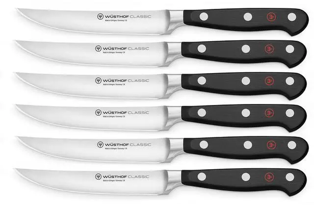 Wusthof's best-selling collection for generations, Classic full-tang knives are precision-forged from a single piece of an exclusive high-carbon stainless steel. Classic knives feature a new handle design made of a highly durable synthetic material Polyoxymethylene (POM) which has a tighter molecular structure to resist fading and discoloration. This set contains six 4 1/2" Steak Knives.
