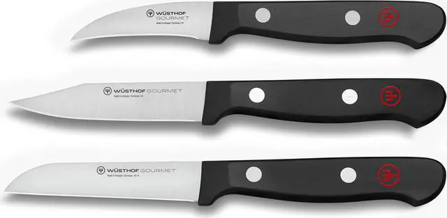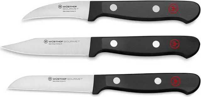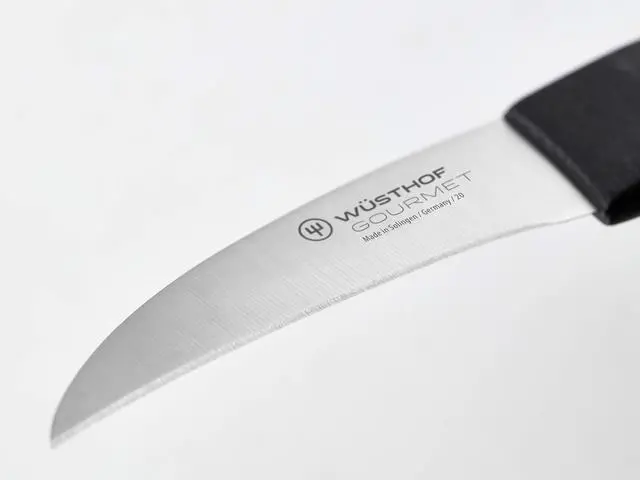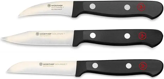 The Wusthof Gourmet Peeling Knife has a shorter blade than KEY_TAB most paring knives and curves upward making it ideal for peeling, KEY_TAB cleaning or shaping any fruit or vegetable with a rounded surface. It is KEY_TAB also the perfect knife to make decorative garnishes such as fluted KEY_TAB mushrooms. The Straight Paring Knife offers a smooth, clean, exact cut KEY_TAB and can be used on a wide variety of smaller cuts of meat, vegetables, KEY_TAB and fruits. The Clip Point Paring Knife is the second most important KEY_TAB knife to have in the kitchen. This knife is designed for all close-hand KEY_TAB tasks. The clip point allows the blade to easily carve and peel fruits KEY_TAB and vegetables
