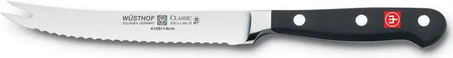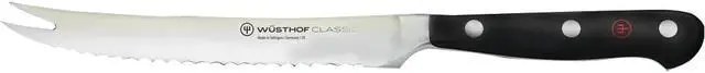 The Wusthof Classic 5 Inch Tomato Knife creates perfect tomato slices every time. KEY_TAB The razor sharp serrated edge cuts effortlessly through even the ripest tomato effortlessly. KEY_TAB Features a fork tip. KEY_TAB Wusthof Classic knives are forged from a single piece of high carbon no-stain steel, a specially alloyed steel. KEY_TAB Painstakingly manufactured, these knives are pure fun to work with and will turn even the preparation of a simple dish into a culinary pleasure. KEY_TAB Made in Solingen, Germany.