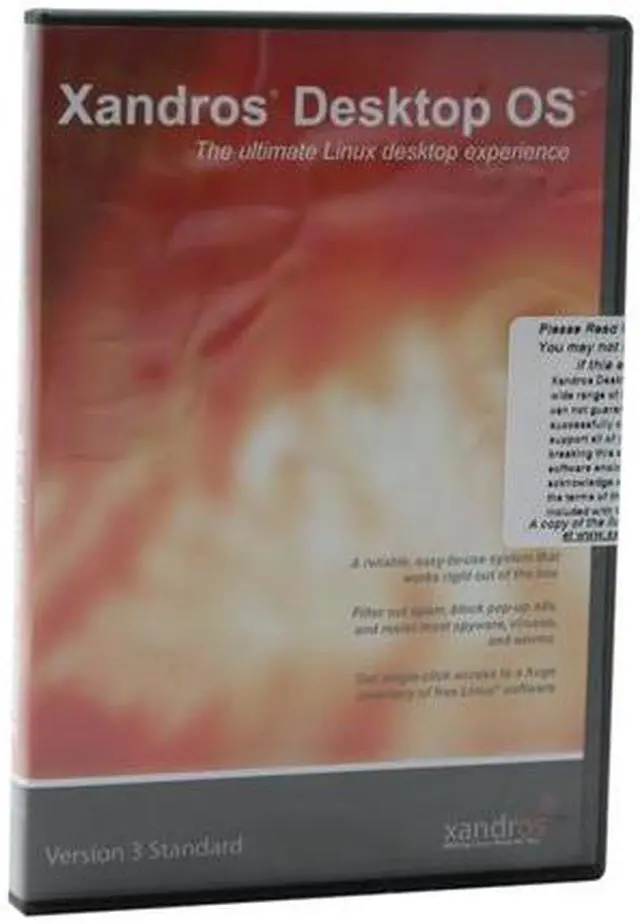 | Feature | Xandros Desktop OS Version 3 Standard Edition gives you everything that you need to get started using Linux. You may have heard that using Linux requires a lot of technical knowledge, even requiring you to work from the command line. It has engineered Standard Edition to be easy-to-use for anyone familiar with Windows. Standard Edition installs with 4-clicks and comes pre-loaded with a variety of useful software like: Mozilla Firefox Web browser Mozilla Thunderbird E-mail OpenOffice.org Suite CodeWeavers CrossOver Office 5.0 30-day trial 30 days of technical support via email With its easy installation, intuitive graphical interface and full suite of productivity applications pre-loaded, Standard Edition is truly "Linux Made Easy." |