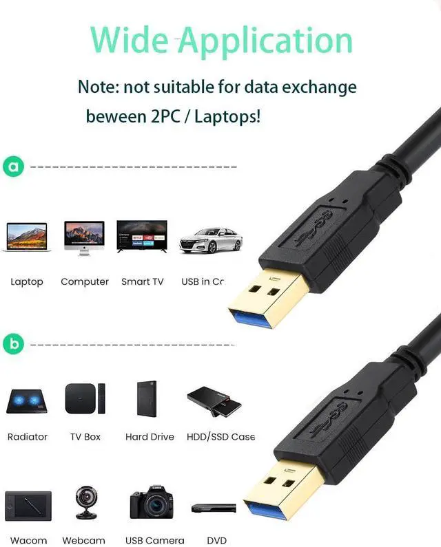Gold Plated High-speed USB 3.0 Type A Male to Male Cable supports connecting USB 3.0 and USB 2.0 peripherals to computer (for Mac or PC). The high-performance USB cable provides convenient connection to external hard drive enclosures(SSD or HDD), printer, modem, cameras, USB in car, set top box and other USB compatible devices. The combination of gold plated conductors and multiple foil & braid shielding layers improve data cable superior performance without data delay and data loss.