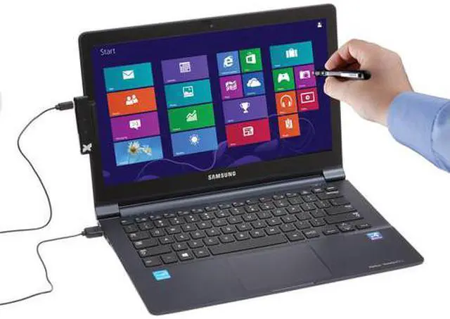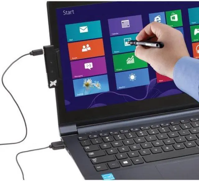 The Windows 8 Touch Pen Designed for 9" to 17" Laptop or Monitor from Xcellon is a touch pen designed to work with screens from 9 to 17 inches in size and mimics the touch functionality of a standard touch screen display. Simply attach the included IR receiver to the side of the screen and connect it to an available USB port. Once the IR receiver has been installed, configure the pen by holding the pen to the red dot in each corner of the screen until you receive on-screen confirmation the pen has been recognized by the sensor.