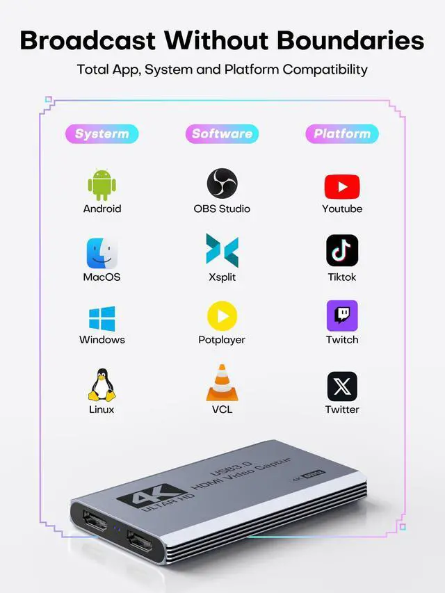 Universal Device & Software SupportWorks with Switch/Switch 2, PS5/4, Xbox Series X/S, Quest 3/3s, DSLR, webcams, TV boxes, and DVDs. Compatible with OBS Studio, Streamlabs, VLC, PotPlayer, Zoom, YouTube, Twitch, Vmix, HDMI Link, MoniCon, QuickTime, and more. Suitable for online meetings, live streaming, screen capture, and video editing
