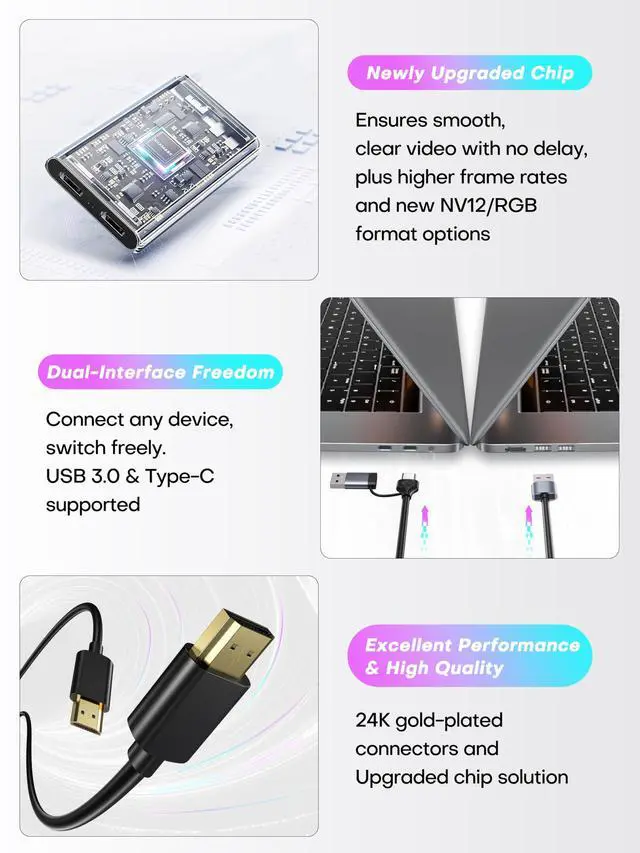 240Hz or 144Hz High Refresh Rate SupportHandles high-frame-rate input up to 2560×1440@144FPS and 1920×1080@240FPS. Supports video formats including MJPEG, YUY2, NV12, and XRGB, offering enhanced flexibility for various streaming and recording requirements. No drivers or external power required
