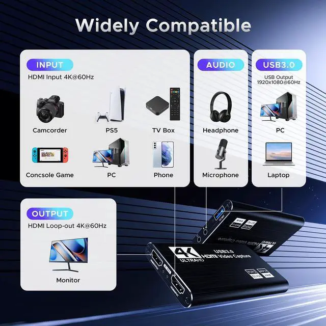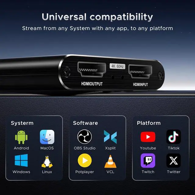 - [Wide Compatibility] Easily streams to Facebook, Youtube or Twitch. With the connection, this HDMI to USB C/3.0 video capture devices can be working on several Operating Systems and various software: Windows 7/ 8/ 10, Mac OS or above, Linux, Android, Laptop, Xbox One, PS3/PS4/PS5, Camera, Webcame, DSLR, Switch, Steam, TV BOX, HDTV, Potplayer/VLC, ZOOM, OBS Studio etc